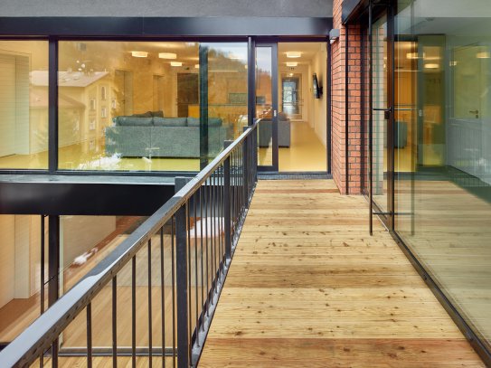 V příčném směru je objekt rozdělen na čtyři samostatné domácnosti pro 16 osob v jednolůžkových pokojích s možností rozšíření na dvoulůžkové a dvě garsoniéry pro pobytovou odlehčovací službu.