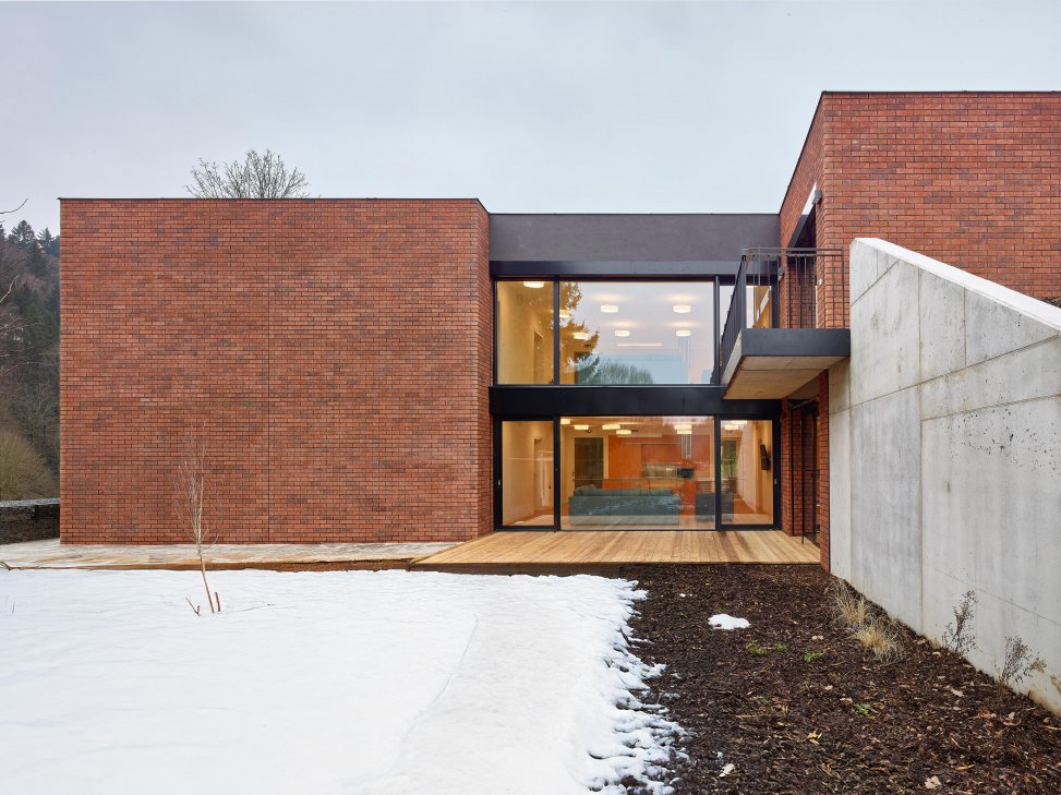 Dům je zapuštěn do svahu a z komunikace se jeví jako jednopodlažní. Zvolený zemitý materiál – režné zdivo na fasádě – umocňuje propojení s terénem. Jako by se stával jeho součástí, jako by jej dotvářel.