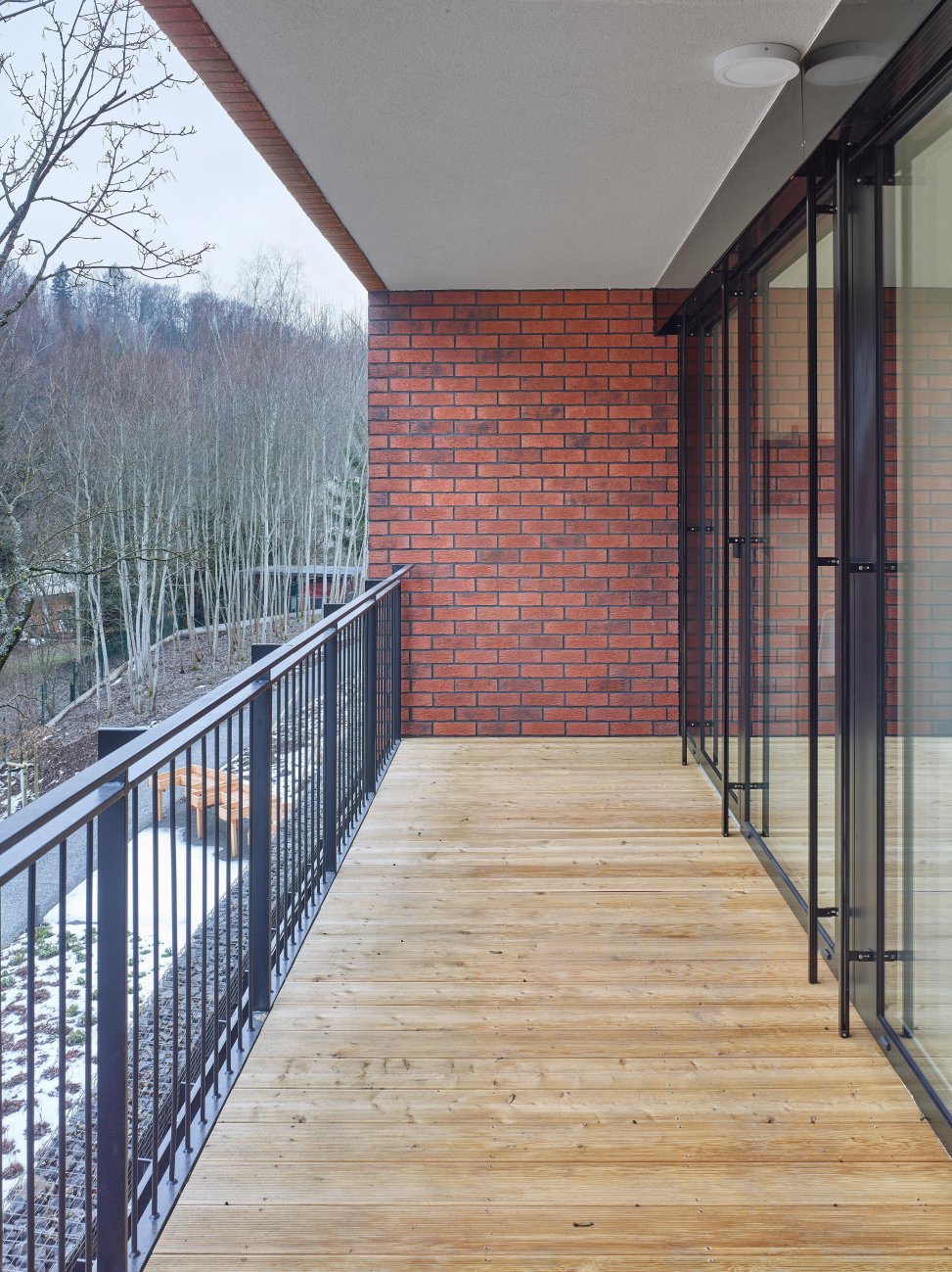 Severní část tvoří provozně-technické zázemí, střední trakt zahrnuje společné pobytové prostory a jižní část je určena pokojům klientů s lodžiemi orientovanými na jih.